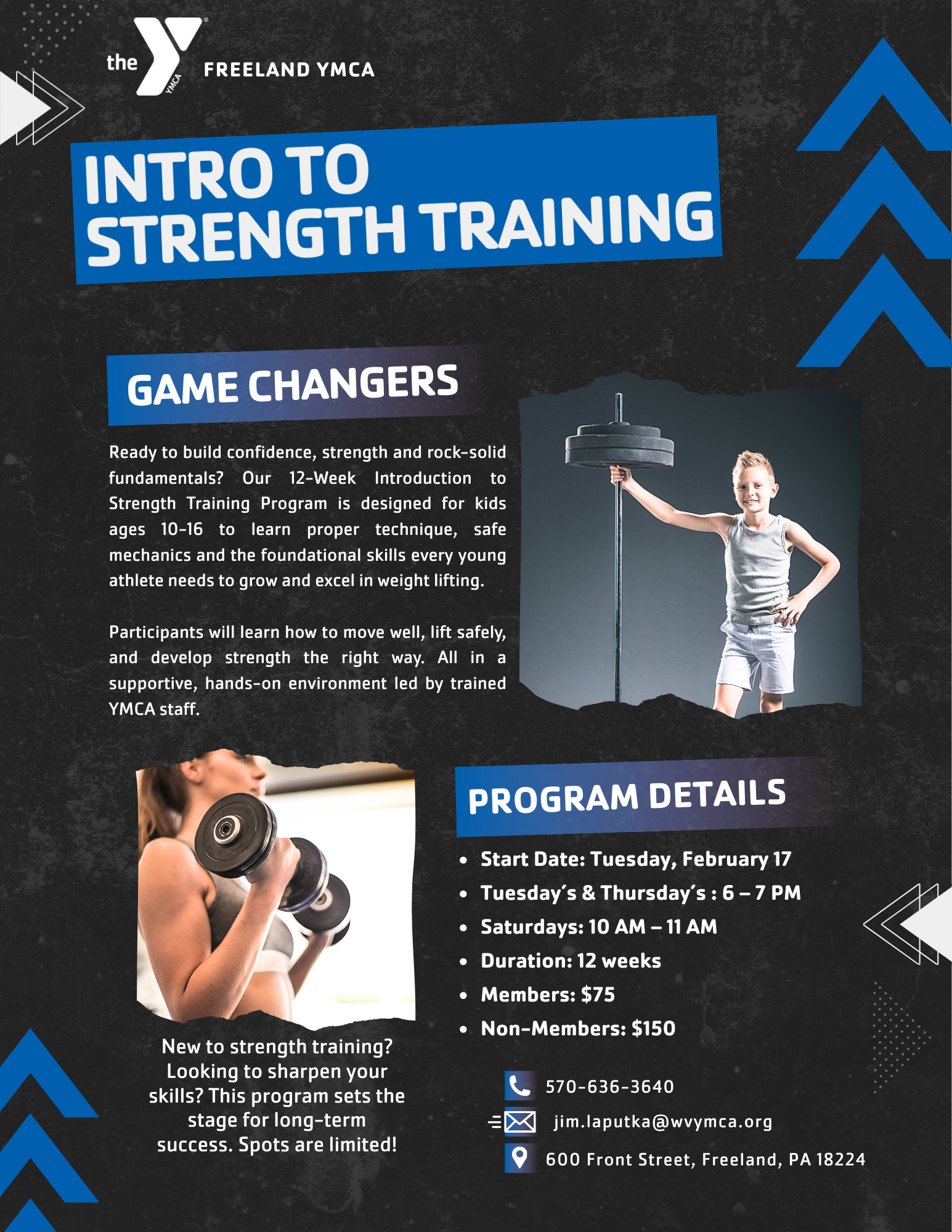 This 12-week program is designed to teach kids 10-16 proper fundamentals and techniques of weight training. This program runs Tuesdays, Thursdays & Saturdays starting 2/17/2026. Stop by the Y and register or online at: https://wvymca.org/programs/